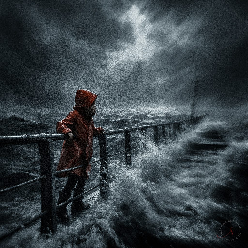 it stretched ever so far into the green, cold shadow the water bruised black beneath us without a star to unfold, or hold, as she shivered with fear her tiny hands reaching for the man standing near. water splashed at the sides the engine stank of diesel, laughter hid tears— the fears of what came next. the storm cloud, green-iced, moved in layers the water choppy and frayed no care for the strangers inside nature’s vortex a quiet human hell— would they survive, who could tell? and still she clung her legs slipped sideways as the boat twisted toward the deep, the metal bars wet beneath her hands racing against the clock of permanent sleep.